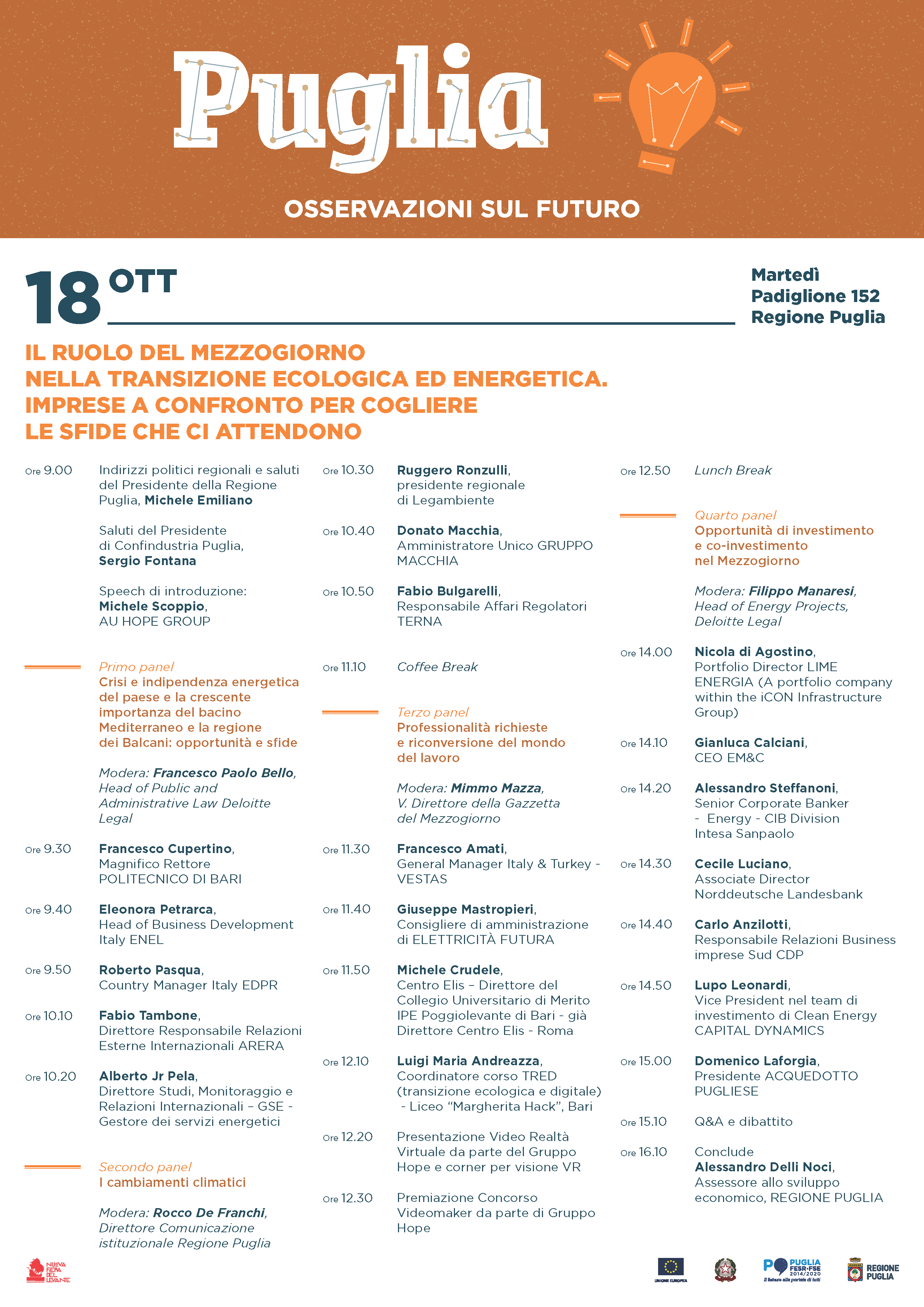 Il quarto e ultimo panel avrà luogo nel pomeriggio, a partire dalle 14, sul tema «Opportunità di investimento e co-investimento nel Mezzogiorno» e sarà moderato da Filippo Manaresi, Head of Energy Projects di Deloitte Legal. Previste alle 16 circa le conclusioni dell’assessore allo Sviluppo Economico della Regine Puglia Alessandro Delli Noci.