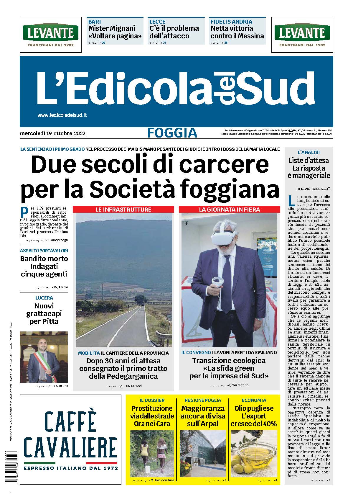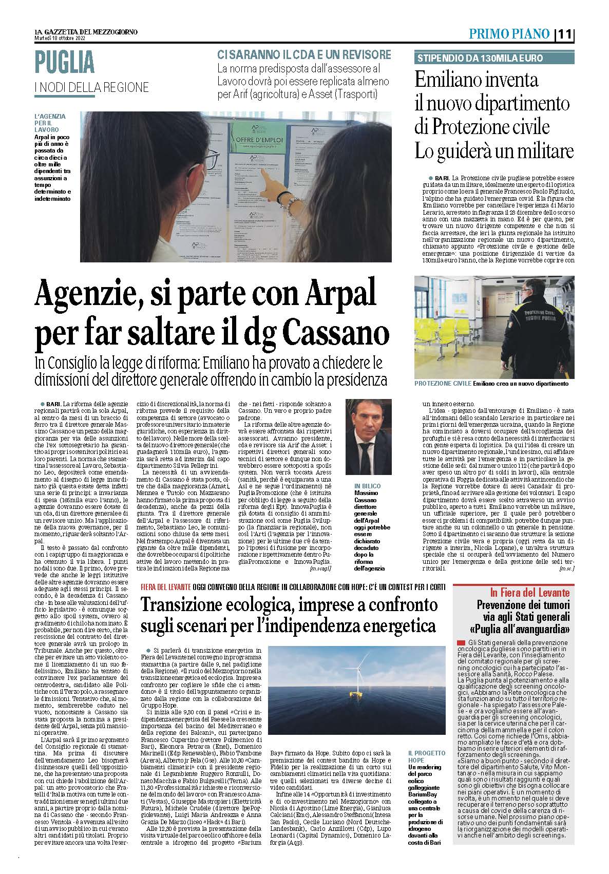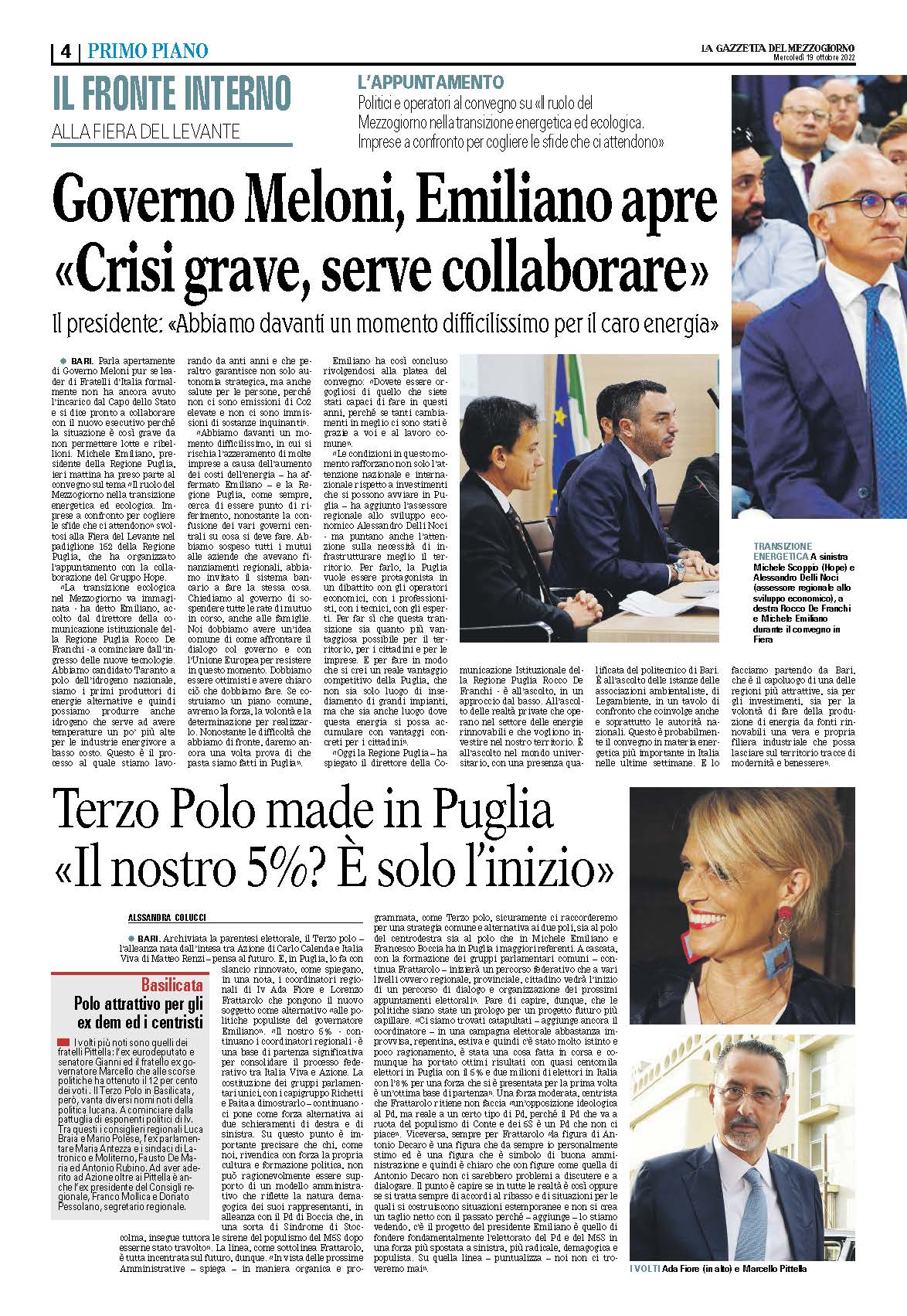 19.10.2022 LA GAZZETTA DEL MEZZOGIORNO: Governo Meloni, Emiliano apre «Crisi grave, serve collaborare» Il presidente: «Abbiamo davanti un momento difficilissimo per il caro energia»