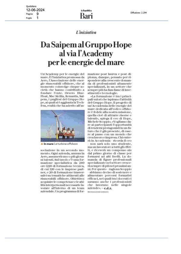20.12.22 La Gazzetta del Mezzogiorno – «Eolico offshore, servono quattro porti» Aero: «Così evitiamo cantieri all’estero»